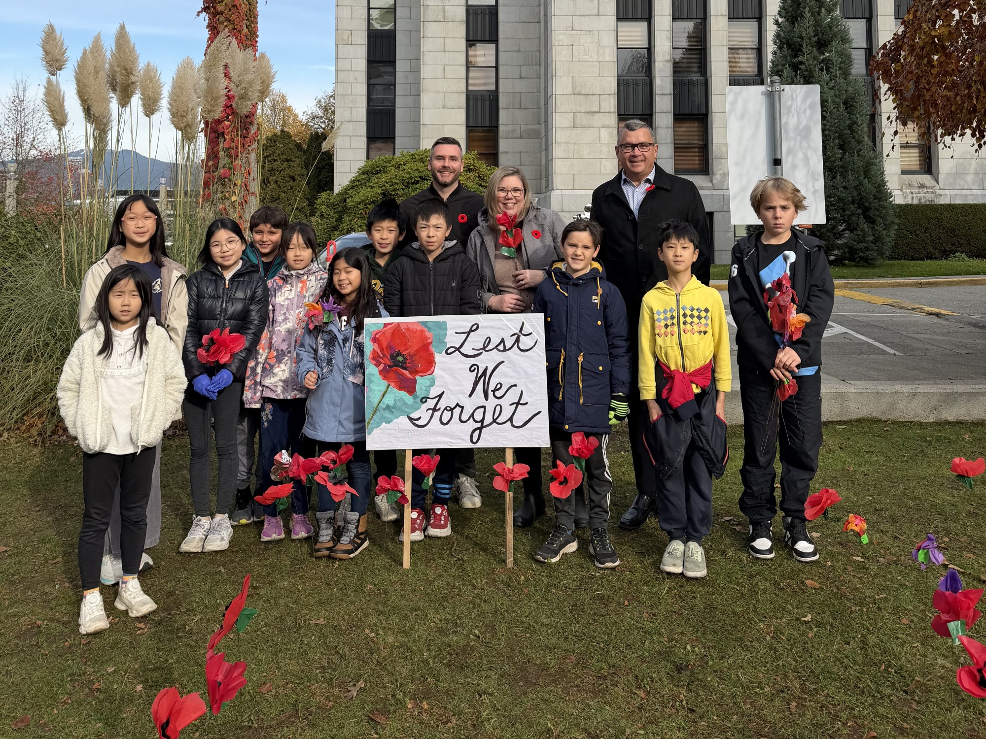 On Remembrance Day, I was honoured to represent the City at ceremonies at the Royal Vancouver Yacht Club and at the Chinatown Cenotaph, paying tribute to those who paid the ultimate sacrifice. Earlier in the month, students, teachers, and parents adorned the front lawn of City Hall with poppies — a simple, powerful reminder that we will remember them.